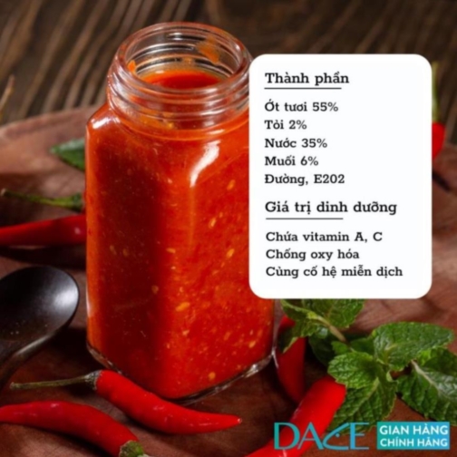 Ớt tươi (55%); Tỏi (2%); Nước (35%); Muối (6%); Đường; Chất bảo quản (E202).