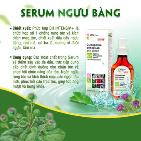 - Serum Elfa Pharm chiết xuất cây Ngưu Bàng kích thích mọc tóc 100ml với chiết xuất chính từ tinh dầu của 7 loại thảo dược quý: dầu ngưu bàng, dầu thầu dầu, dầu hạt lanh, dầu tuyết tùng, dầu hương thảo, dầu quả bơ, dầu hạt mỡ làm tăng tuần hoàn máu và cung cấp dinh dưỡng cho nang tóc chắc khỏe, phục hồi tóc hư tổn, bao bọc mái tóc giúp bảo vệ, do đó ngăn ngừa sự mất độ ẩm tóc tự nhiên.