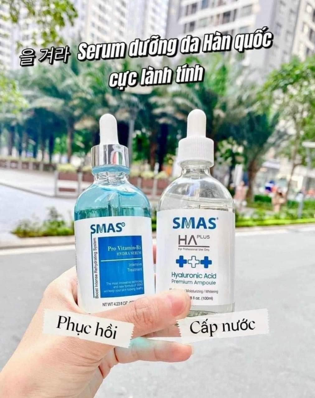 serum ha smas và serum b5 smas là dòng sản phẩm serum smas dưỡng ẩm trẻ hoá làn da và phục hồi hư tổn đến từ thương hiệu dược mỹ phẩm SMAS Hàn Quốc. serum ha smas tăng cường độ ẩm cho làn da của bạn cải thiện khả năng giữ nước của da hiệu quả, serum b5 smas chính là chìa khóa để phục hồi, cải tạo làn da.