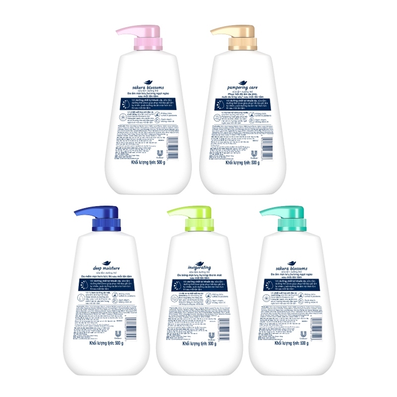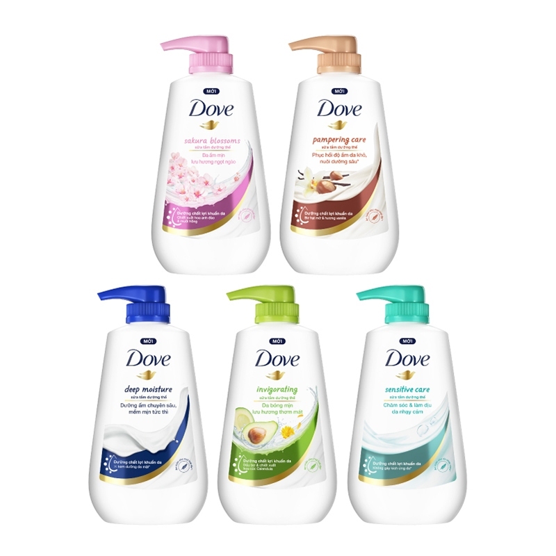 SỮA TẮM DƯỠNG THỂ DOVE CHĂM DA MỀM MỊN TỨC THÌ VỚI DƯỠNG CHẤT LỢI KHUẨN DA 1. Sữa tắm dưỡng thể Dove Deep Moisture dưỡng ẩm chuyên sâu, mềm mịn tức thì - Với ¼ kem dưỡng da mặt, sữa tắm dưỡng thể Dove Deep Moisture dưỡng ẩm sâu, giúp nuôi dưỡng làn da mềm mịn từ sâu bên trong sau mỗi lần tắm. 2. Sữa tắm dưỡng thể Dove Sakura Blossoms da mềm mịn, hương hoa anh đào - Với chiết xuất hoa anh đào và muối hồng, sữa tắm dưỡng thể Dove Sakura Blossoms nhẹ nhàng làm sạch, cho da mềm mịn và lưu hương hoa anh đào ngọt ngào tươi mát sau mỗi lần tắm. 3. Sữa tắm dưỡng thể Dove Invigorating da bóng mịn lưu hương thơm mát - Với dầu bơ và chiết xuất hoa cúc calendula, sữa tắm dưỡng thể Dove Invigorating nhẹ nhàng làm sạch, giúp nuôi dưỡng làn da căng bóng mịn màng, lưu hương thơm mát bừng sức sống sau mỗi lần tắm. 4. Sữa tắm dưỡng thể Dove Sensitive Care chăm sóc & làm dịu da nhạy cảm - Với công thức không chứa các thành phần hóa học và hương liệu gây kích ứng da, sữa tắm dưỡng thể Dove Senstitive Care an toàn và lành tính cho da nhạy cảm, chăm sóc dịu nhẹ, cho da mềm mịn sau mỗi lần tắm. 5. Sữa tắm dưỡng thể Dove Pampering Care phục hồi độ ẩm da khô, nuôi dưỡng sâu - Với bơ hạt mỡ và hương vanilla, sữa tắm dưỡng thể Dove Pampering Care giúp phục hồi độ ẩm da khô, chăm da mềm mịn và lưu hương vanilla ngọt ngào sau mỗi lần tắm. HIỆU QUẢ SỬ DỤNG Sữa tắm dưỡng thể cho da mềm mịn hơn tức thì sau mỗi lần tắm*. *Hiệu quả thực tế của sản phẩm tuỳ thuộc vào tình trạng của từng người sử dụng. Sản phẩm được Viện da liễu Trung Ương chứng nhận an toàn cho mọi loại da, kể cả da nhạy cảm. Công thức sạch nhanh, không nhờn rít với lớp bọt dày mịn. HƯỚNG DẪN SỬ DỤNG Chỉ sử dụng ngoài da, tránh tiếp xúc với mắt. Nếu dính sản phẩm vào mắt, hãy rửa kĩ bằng nước. Chú ý: Chỉ sử dụng ngoài da, tránh tiếp xúc với mắt. Nếu dính sản phẩm vào mắt, hãy rửa kĩ bằng nước.