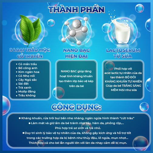 Kháng khuẩn tự nhiên kết hợp với Nano Bạc giúp nhẹ nhàng rửa sạch bụi bẩn, dầu thừa và bảo vệ da của bé, giữ ẩm cho da, làm mát da, ngăn ngừa và chăm sóc vùng da bị rôm sảy, lở ngứa, lông măng, thủy đậu, mụn nhọt, hăm da, phồng da ở trẻ sơ sinh và trẻ nhỏ.