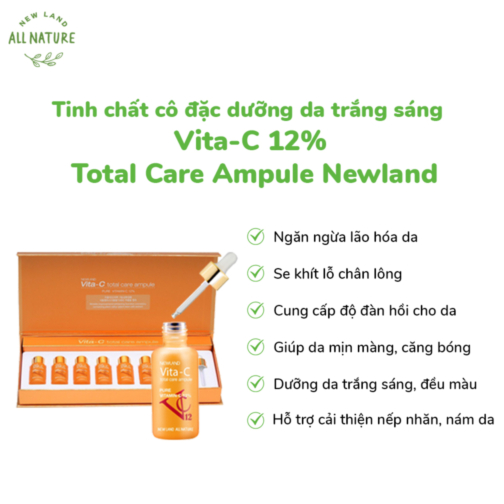 Tinh chất cô đặc dưỡng da trắng sáng Vita-C Total Care Ampule Newland có chứa hàm lượng 12 % vitamin C nguyên chất; thành phần “vitamin peptide” và chứa chiết xuất từ tế bào gốc thực vật có tác dụng kích hoạt các tế bào da giúp tế bào da luôn khỏe mạnh; ức chế sắc tố trên da hỗ trợ làm mờ các đốm nâu hoặc cải thiện vùng da bị ửng đỏ, giúp ngăn ngừa lão hóa, dưỡng sáng, làm đều màu da và cải thiện nếp nhăn.