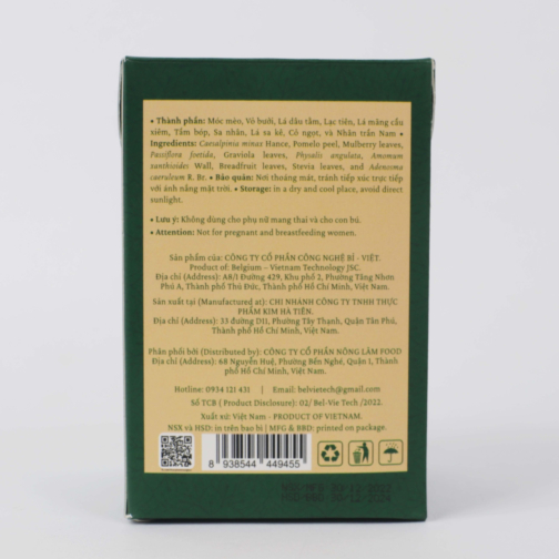 5. Thành phần: 100% thảo mộc bao gồm móc mèo, vỏ bưởi, lá dâu tằm, lạc tiên, lá mãng cầu xiêm, tầm bóp, sa nhân, lá sa kê, cỏ ngọt và nhân trần nam.