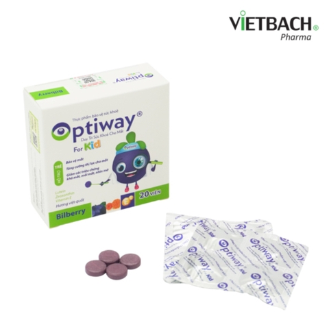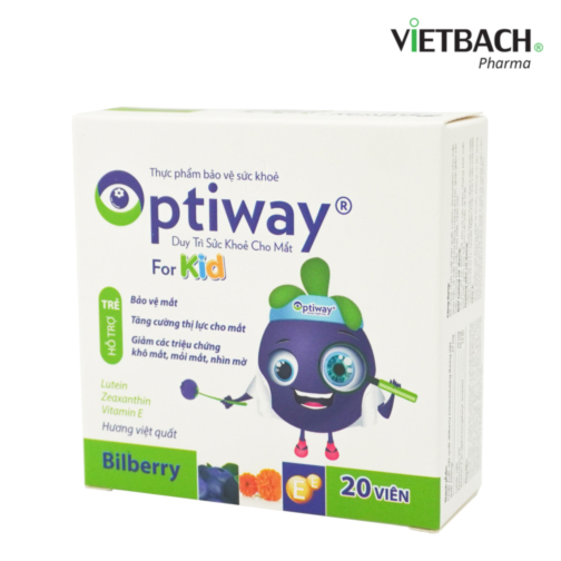 - Viên bổ mắt cho bé bổ mắt cho bé OPTIWAY FOR KID có công thức bổ sung VIỆT QUẤT ĐEN – loại thảo dược CHÂU ÂU có chứa chất chống oxy hóa được chứng minh lâm sàng hiệu quả giảm độ cận, chống tăng độ cận ( TẬT KHÚC XẠ) cho trẻ. Ngoài Việt quất châu âu Bilberry còn bổ sung vitamin E thiên nhiên , CẶP ĐÔI CHỐNG ÁNH SÁNG XANH LUTEIN – ZEAXANTHIN 2 loại dưỡng chất cho đôi mắt sáng khỏe, làm giảm nguy cơ đau mỏi mắt, thoái hóa điểm vàng do bé ham xem máy tính, điện thoại.