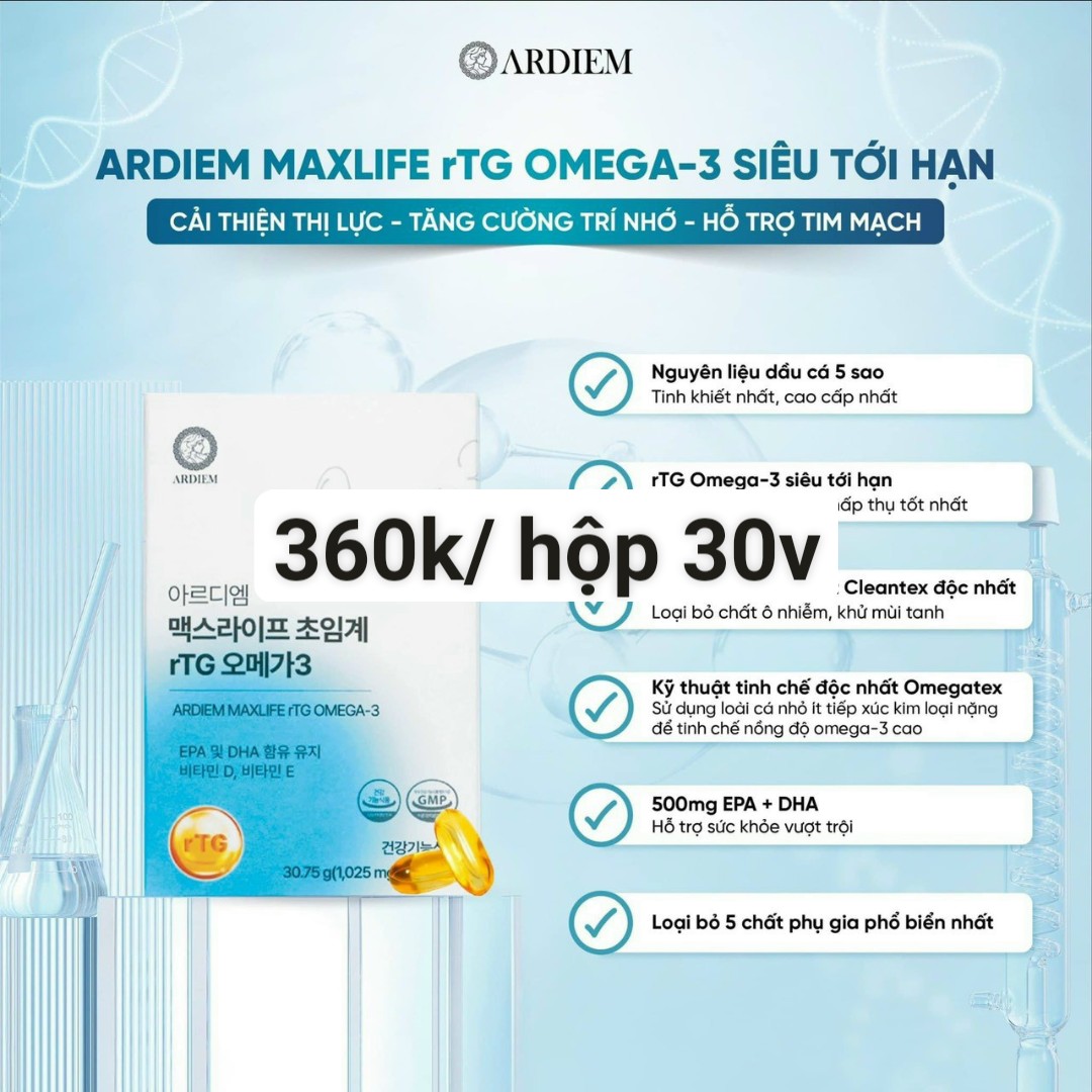 Viên uống dầu cá bổ não, hỗ trợ sức khỏe mắt và tim mạch rTG OMEGA-3 là thực phẩm hỗ trợ sức khỏe với nguyên liệu sạch từ Đại Tây Dương kết hợp cùng công nghệ sản xuất tiên tiến Tây Ban Nha. rTG OMEGA-3, cùng vitamin D, E được bổ sung nhằm: