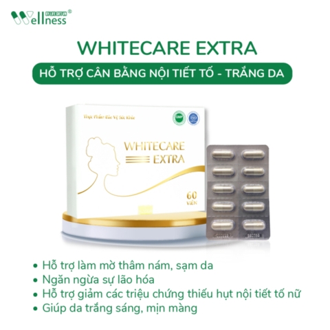Viên uống trắng da, cân bằng nội tiết tố WhiteCare Extra với 3 thành phần chính bao gồm: Cao chè dây, chiết xuất hạt thảo quyết minh, chiết xuất mầm đậu nành.